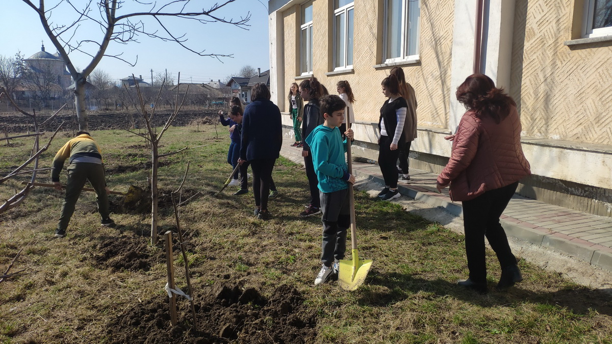 Pomii plantați anul trecut în cadrul proiectului „Livada de la școală” au nevoie de întreținere periodică. Elevii școlii noastre, coordonați de doamna profesor Elena Harasim, sunb bucuroși să ajute.